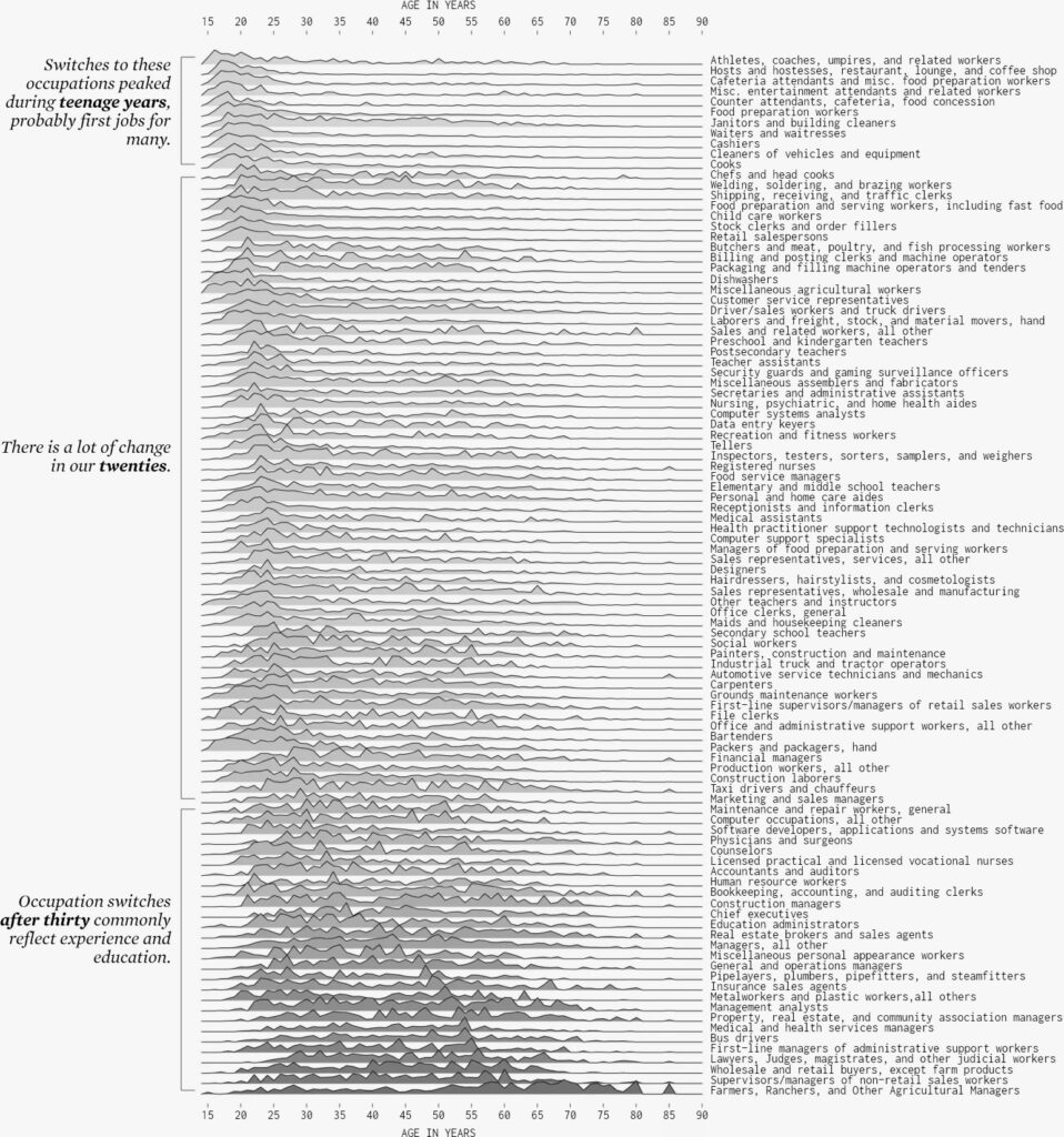 Keen to understand the age at which people decide to switch jobs and careers, Data Scientist Nathan Yau crunched the numbers from more than 110k people who changed jobs between the years 2011 and 2018. His discoveries have highlighted that time changes both our career options and the career choices we make.